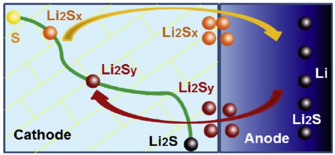 鋰硫電池中多硫化物穿梭效應簡圖(圖源:Cheng X-B,Huang J-Q,Peng H-J,et al.Polysulfide shuttle control:towards alithium-sulfur battery with superior capacity performance up to 1000 cycles by matching thesulfur/electrolyte loading)