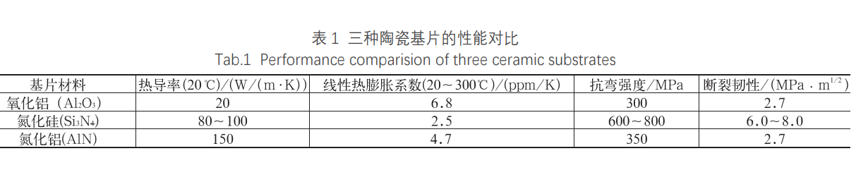 目前常用陶瓷絕緣基片材料包括氧化鋁、氮化鋁和氮化硅三種,以下三種陶瓷基板的性能對比。