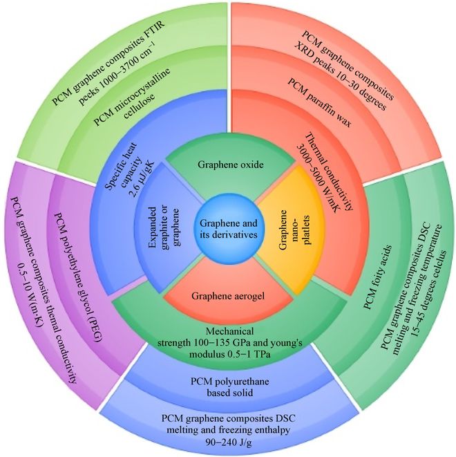 本文是一篇非常新穎的綜述,對石墨烯(Gr)及其衍生物熔融相變材料的整個物理、結構和熱表征都進行了詳細的討論。首先介紹了Gr及其衍生物熔融相變材料及其應用。還研究了Gr及其衍生物,如GA、GNPs、EG和GO的形態(tài)(物理結構)和熱表征。然后介紹了Gr、GO、GNPs和GA對相變納米復合材料(PCNC)不同性能的影響。最后總結了本文的結論,并對未來進行了展望。
