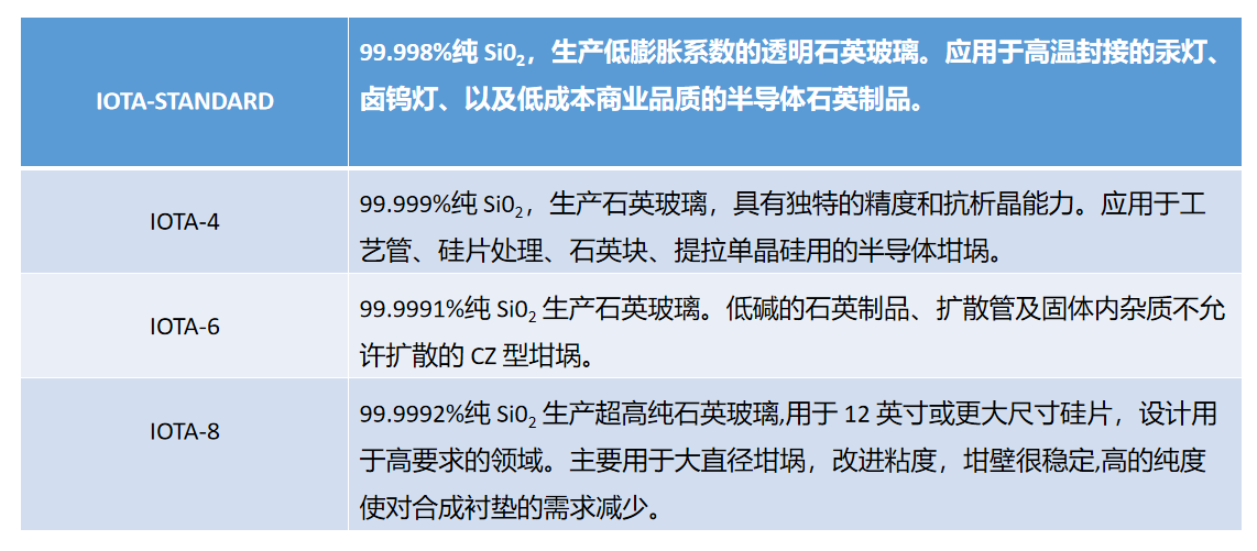 江蘇太平洋石英股份有限公司是一家集科研、生產、銷售為一體的硅資源深加工企業。經過二十多年專業的研究與發展已成為全國石英材料行業中的龍頭企業,主要服務領域涉及光源、光伏、光纖及半導體用石英材料等。公司主導產品有高純石英砂、石英管(棒)、大口徑石英擴散管、石英坩堝、各種石英器件等。石英股份生產的PQS級高純石英砂雜質含量小于20×10-6,已超過美國尤尼明的IOTA-STANDARD等級石英砂產品的純度。2021年石英股份高純石英砂產能為2萬噸/年。