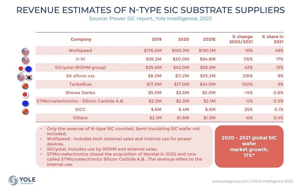 Yole化合物半導(dǎo)體技術(shù)和市場(chǎng)高級(jí)分析師Poshun Chiu告訴我們:"襯底是SiC器件成本的一個(gè)非常大的部分....。對(duì)于參與者來(lái)說(shuō),擁有自己的內(nèi)部供應(yīng)是非常重要的,這樣他們就可以長(zhǎng)期控制其器件開(kāi)發(fā)的內(nèi)部成本"。