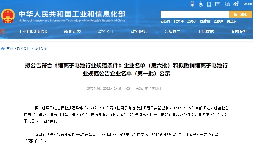 12月16日,工業和信息化部公示符合《鋰離子電池行業規范條件》企業名單(第六批)。第六批公示名單中,13家企業入選,涉及正極材料、隔膜、消費型電池、動力型電池、儲能型電池等多個領域。另外,有6家已公告企業,因不能保持規范條件要求,擬撤銷其規范條件企業名單。目前,符合鋰離子電池行業規范條件的企業名單已發布五批,共計57家企業入選。加上第六批新增13家企業以及6家擬撤銷企業,符合鋰離子電池行業規范條件的企業達64家。
