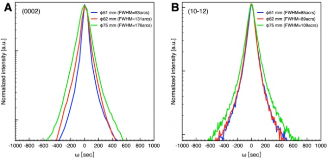 圖六 3英寸AlN襯底的HRXRD搖擺曲線:(A)(0002)對稱反射和(B)(10-12)非對稱反射