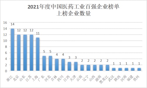 12月18日下午,在2022(第39屆)全國醫藥工業信息年會上,“2021年度中國醫藥工業百強榜”發布。據榜單所示,浙江省上榜企業最多,有14家;北京、山東、江蘇緊隨其后,有12家;上海有11家。5省醫藥工業百強企業占總數61%。
