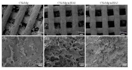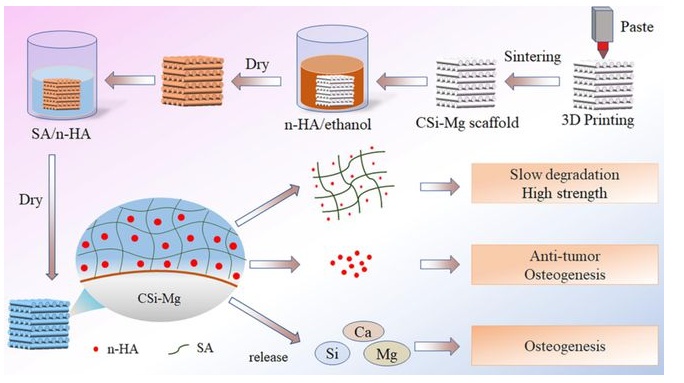 近期,杭州電子科技大學、南京醫科大學及浙江大學合作研發了一種摻鎂硅灰石/納米羥基磷灰石生物陶瓷多孔支架,該支架利用物理吸附機制在摻鎂硅酸鈣生物活性陶瓷支架表面修飾了n-HA涂層,使原有的摻鎂硅酸鈣支架具有長時間保持高力學性能的同時,具有顯著的抗腫瘤效果。本研究設計的陶瓷支架具有高的力學強度,可調控的降解性能,良好的生物活性,能夠有效促進腫瘤細胞(MG63)凋亡以及抑制腫瘤細胞遷移。