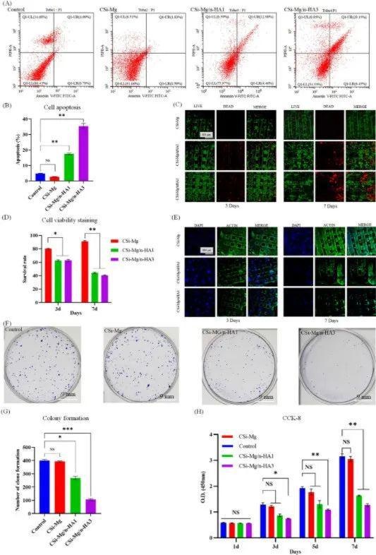 為了探究支架對腫瘤細胞生長增殖的影響,作者做了細胞凋亡實驗、細胞活死染色、細胞形態染色、細胞克隆實驗以及CCK-8實驗,實驗結果都表現出表面n-HA厚度越厚,腫瘤細胞的凋亡情況越顯著。培養7天后,CSi-Mg/n-HA3支架誘導體外人骨肉瘤細胞(MG-63)約50%的細胞死亡。