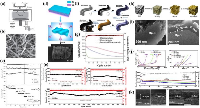 【圖2】(a–c)硅納米線的合成方法、SEM圖像和電化學特性。(d,e)硅納米片的設計策略、SEM圖像和電化學性能。(f-g)通過硅烷水解合成硅納米管和比較性質。(h)合成多孔硅的表面工程策略。(i-k)多孔硅的表面形貌、電化學循環和循環后體積變化的比較。
