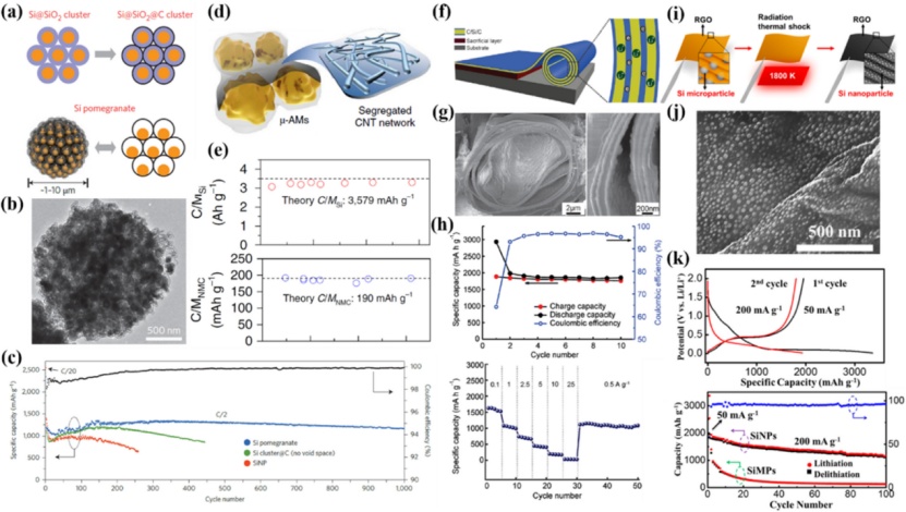 【圖3】(a–c)蛋黃殼硅碳的合成過程、TEM圖像和循環特性。(d,e)用碳納米管制備復合硅材料的簡單方法和組裝電池的電化學性能。(f)硅碳復合層狀負極結構;(g-h)SEM圖像和硅基負極的電化學性能。(i)用還原的氧化石墨烯(rGO)合成硅基負極的策略;(j)rGO上硅分布的掃描電鏡圖像;(k)和負極材料的容量。