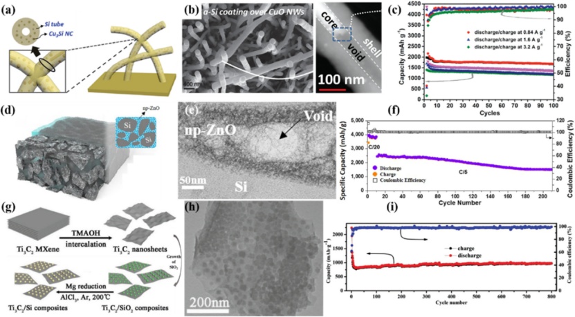 【圖4】(a)硅銅合金負極的設計策略;(b)負極的SEM和TEM圖像;以及(c)硅銅合金負極在840mAg-1、1600mAg-1和3200mAg-1下的電化學性能。(d)Si納米粒子-ZnO/SiMP電極結構的一體化設計;(e)透射電子顯微鏡圖像;和(f)在C/5下負極的長循環容量測試。(g)負載Si納米顆粒的Ti3C22D材料示意圖;(h)透射電子顯微鏡下硅納米顆粒的分布;和(i)Ti3C2/Si在1000mAg-1的長期循環下的容量和穩定性。