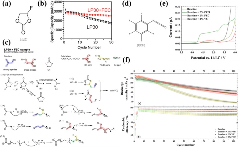 【圖5】(a)FEC添加劑的結構式;(b)含FEC的硅基鋰離子電池在120mAg-1電流密度下的電化學性能;和(c)FEC的反應機理。(d)PFPI添加劑的結構式;(e)幾種添加劑的線性掃描伏安法;和(f)在1C和PFPI下長期循環的全電池的容量和穩定性。