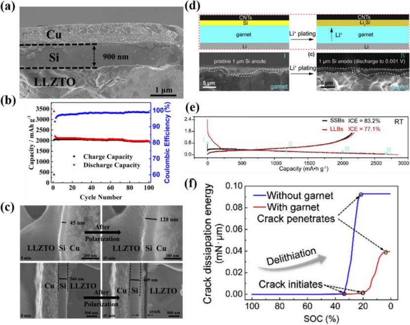 【圖8】(a)使用LLZTO電解質組裝的硅負極全固態電池的結構;(b)具有45nm厚度的Si層的電池的電化學循環鋰儲存性能;以及(c)極化后與45nm和360nm厚的硅層的電解質的界面接觸。(d)用石榴石電解質組裝的硅基負極電池的鋰電鍍;(e)固態和液態電池的初始庫侖效率比較;和(f)有或沒有石榴石的裂紋耗散能。