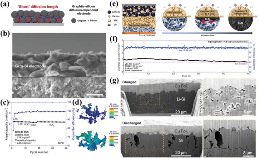 【圖9】(a)硫化物電解質全固態電池中硅碳復合電極的電子傳輸路徑;(b)硅基負極電池的SEM圖像。(c,d)電池循環性能和在0.01V放電期間不同尺寸硅顆粒中鋰離子濃度的模擬圖像。μ-Si基負極的鋰化過程;(f)室溫下的長期循環性能測試;和(g)鋰嵌入和脫鋰的SEM圖像。