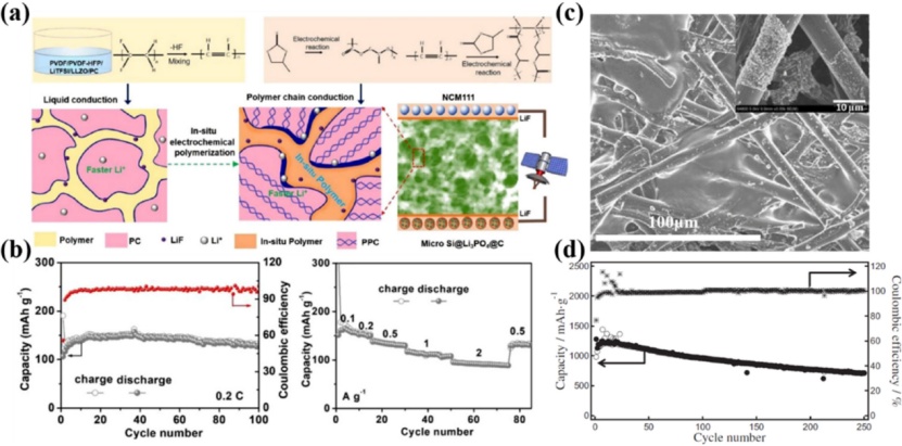 【圖10】(a)多孔復合聚合物電解質膜的構建和(b)以NCM811為正極組裝的PVDF基聚合物電解質電池的電化學性能。(c)與PEO電解質膜配對的硅碳復合負極的SEM圖像和(d)其長期循環性能。