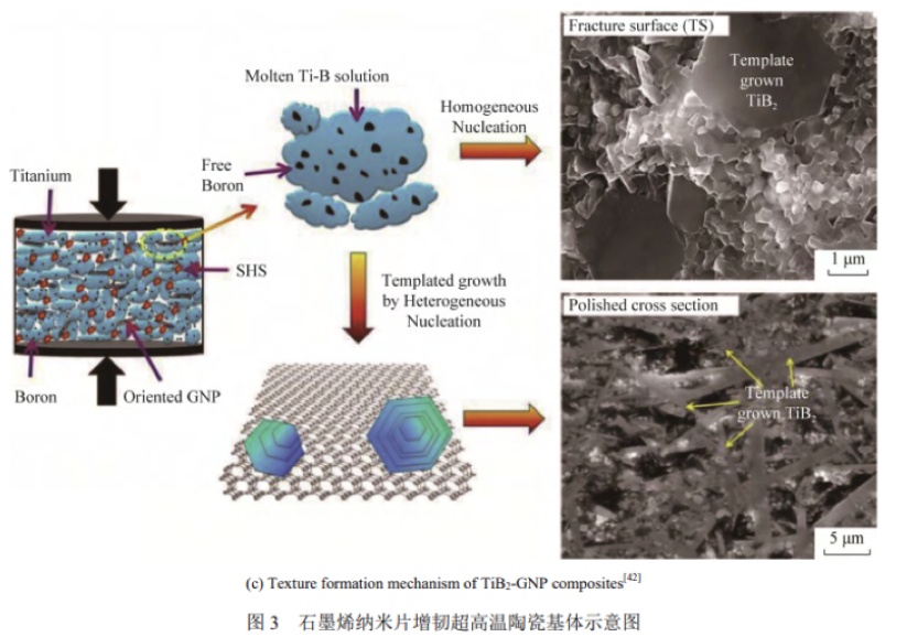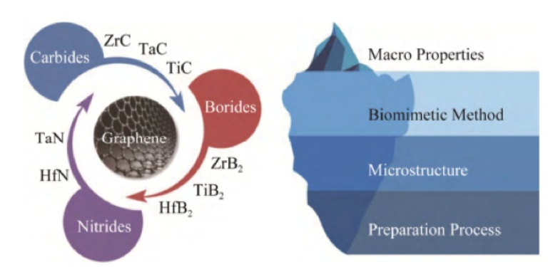 超高溫陶瓷熱沖擊性能差,根本原因就是在高溫極端條件下,晶須和纖維等傳統(tǒng)增韌相的損傷和失效,而石墨烯優(yōu)異的力學(xué)和熱學(xué)性能可以提高陶瓷基復(fù)合材料的韌性和熱力學(xué)性質(zhì)。而恰恰石墨烯的增韌作用使其能夠抵抗由于熱沖擊、化學(xué)侵蝕和高速等離子體流造成的開裂,進(jìn)而改善了其抗熱震性能。