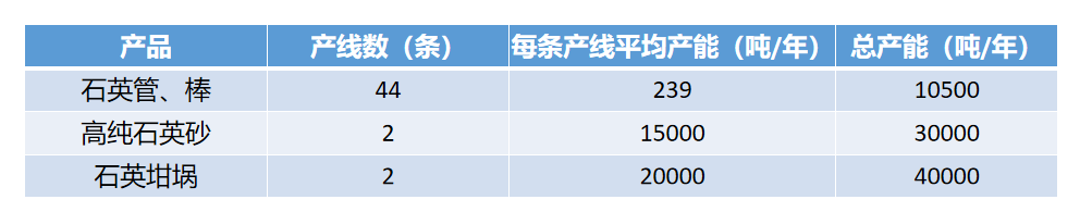 江蘇太平洋石英股份有限公司是一家集科研、生產(chǎn)、銷售為一體的硅資源深加工企業(yè)。經(jīng)過(guò)二十多年專業(yè)的研究與發(fā)展已成為全國(guó)石英材料行業(yè)中的龍頭企業(yè),主要服務(wù)領(lǐng)域涉及光源、光伏、光纖及半導(dǎo)體用石英材料等。公司主導(dǎo)產(chǎn)品有高純石英砂、石英管(棒)、大口徑石英擴(kuò)散管、石英坩堝、各種石英器件等。石英股份生產(chǎn)的PQS級(jí)高純石英砂雜質(zhì)含量小于20×10-6,已超過(guò)美國(guó)尤尼明的IOTA-STANDARD等級(jí)石英砂產(chǎn)品的純度。2021年石英股份高純石英砂產(chǎn)能為2萬(wàn)噸/年。