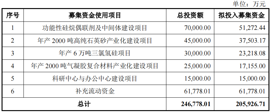 據披露,此次募資將用于功能性硅烷偶聯劑及中間體建設項目、年產2000噸高純石英砂產業化建設項目、年產6萬噸三氯氫硅項目、年產2000噸氣凝膠復合材料產業化建設項目、科研中心與辦公中心建設項目及補充流動資金。