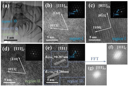 Sr(Zr0.95Ti0.05)O3陶瓷的(a)TEM明場像,(b)、(c)、(d)和(e)對應的高分辨像,(f)和(g)傅立葉變換圖像