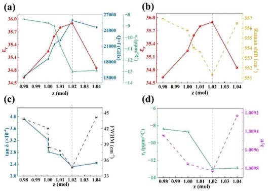 (Sr0.7Ca0.3)z(Zr0.95Ti0.05)O3(0.98≤z≤1.04)陶瓷的介電特性、Ag峰的拉曼頻移、FWHM、晶格結構a/c與其非化學計量比z的相互關聯圖