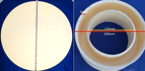 大尺寸/復雜形狀高純氧化鋁陶瓷部件在集成電路制造、航空航天、深海探測等領域有著廣泛的應用,但其制備工藝極具挑戰性。國內高純氧化鋁陶瓷在尺寸、性能及穩定性等方面與國外同類產品還存在較大差距。中國科學院上海硅酸鹽研究所王士維研究員帶領的科研團隊與江西中科特瓷新材料有限公司合作,基于具有自主知識產權的自發凝固成型體系,突破大尺寸陶瓷素坯在干燥和燒結過程中的變形及開裂等關鍵瓶頸,成功制備出直徑達1010mm的超大尺寸高純氧化鋁陶瓷圓盤和外徑為200mm的雙層同心高純氧化鋁圓筒,材料主要性能指標優于國外同類產品水平。