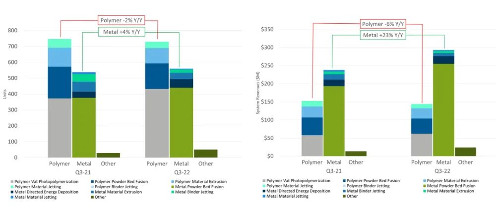 全球的通貨膨脹壓力導致所有級別的設備價格上漲,從而支撐了收入增長。工業級的金屬廠商也再次受益于對更有效和更有生產力的機器需求轉變,并推動了行業收入的增加。如金屬粉末床熔融設備,它有更多的激光器和更高的效率,可以實現更高的產量。