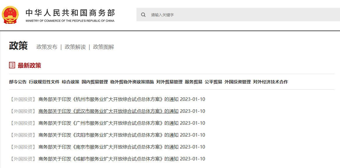 中國粉體網訊 1月10日,為全面有效推進服務業擴大開放綜合試點工作,商務部官網印發包括杭州、武漢、廣州、沈陽、南京、成都在內的六市服務業擴大開放綜合試點總體方案的通知。