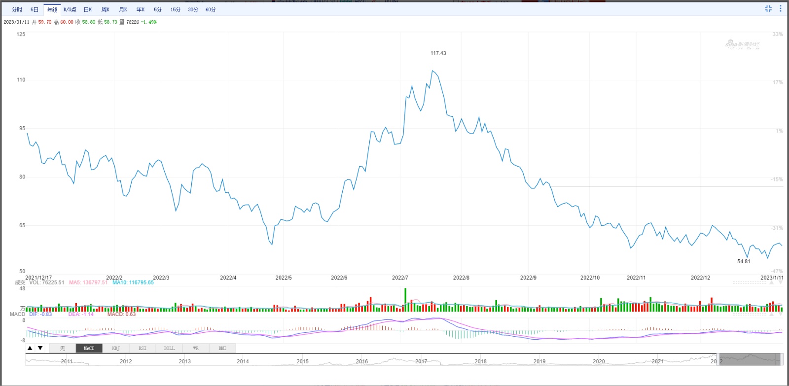 與業(yè)績保持的快速增長不同,2022年第三季度以來,當(dāng)升科技的股價遭遇了重創(chuàng)。2022年7月中旬,當(dāng)升科技股價最高曾達(dá)到117.43元/股,此后開始滑坡,1月11日收盤報58.8元/股,累計跌幅達(dá)到49.93%,總市值297.82億元。