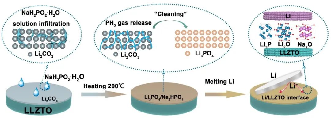 鋰金屬負極理論容量高、反應電位低,因此鋰金屬電池具有更高的能量密度和更廣泛的正極材料選擇,然而有機電解液的易燃性和鋰枝晶的不可控生長使得鋰金屬電池存在一定安全隱患。采用固態電解質取代電解液可以在根本上提高電池的安全性和穩定性。其中摻雜的石榴石型固態電解質Li7La3Zr2O12(LLZO)具有室溫離子電導率高、電化學窗口寬、對鋰金屬穩定等優勢,是氧系陶瓷電解質的首選。然而LLZO面臨著表面易形成Li2CO3鈍化層、與鋰金屬界面接觸差等問題,導致負極-電解質(Li/LLZO)界面存在大的界面阻抗,嚴重阻礙了鋰離子的界面傳輸,而且不均勻的界面接觸易引起鋰金屬的局部沉積,導致鋰枝晶在陶瓷晶界處的生長,這些限制了固態鋰金屬電池的發展。因此,實現Li/LLZO界面的鈍化層消除/轉換和親鋰潤濕改性具有重要意義。