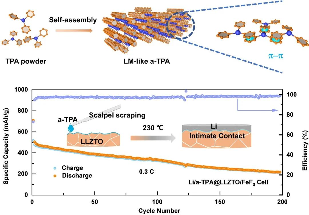 基于Li/LLZO界面難以在反復鋰沉積/剝離演變中持久愈合的問題,該團隊提出了一種“可合金粘流體焊接”策略,以構筑具備高度自愈合能力的Li/LLZO界面層。通過熱激發誘導三苯基銻(TPA)中苯環面間的π-π共軛相互作用,使其自組裝成油性導電網絡,進而形成類液態金屬的流體聚合物(a-TPA)。該粘性流體通過簡單刮涂易均勻地附著在LLZO陶瓷表面,經過熱鋰化和電化學鋰化,可原位構建以Li3Sb、LiSbO3和Li2C2等成分為主的離子/電子混合導電層,其表現出對鋰金屬的耐久浸潤性和優異鋰擴散行為,對應界面的面電阻可降低至60℃下6Ωcm2。受益于陶瓷界面對轉換反應產物的限域和壓實,Li/a-TPA@LLZO/FeF3固態電池表現出長循環和高倍率性能(0.2C和2C下的可逆容量分別為520和330mAhg-1),Li/a-TPA@LLZTO/CuF2電池同樣表現出顯著優于電解液體系的可充性能(Adv.Funct.Mater.2022,2208013, DOI:10.1002/adfm.202208013)。