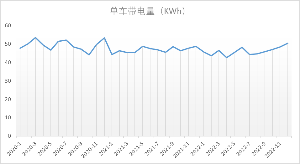 在單車帶電量方面,結(jié)合電池裝機量和新能源車產(chǎn)量,2022年單車平均帶電量約為41.74kwh,而汽車協(xié)顯示的2022年12月的單車平均帶電量為50.4kwh(我根據(jù)12月份的裝車量和新能源產(chǎn)量計算得到的是45.74kwh)。