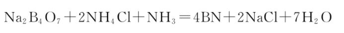 利用固相反應法制備六方氮化硼,是指將含硼化合物和含氮化合物均勻混合在一起,在持續高溫狀態下進行固相反應,將煅燒后的產物經后續的除雜處理得到結晶度高和粒度均勻的氮化硼粉體。用固相反應法來制備六方氮化硼,通常使用硼砂(Na2B4O7)和氯化銨(NH4Cl)作為原料,在氨氣氛圍下加熱到900~1100℃下保溫5h,其反應方程式如下:
