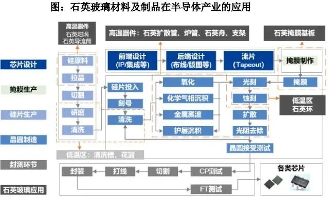 在半導體生產過程中,石英玻璃制品主要應用于單晶硅制造和晶圓制造兩個環節。各類石英部件和儀器是清洗、氧化、光刻、刻蝕、擴散等環節中所需要的材料。石英玻璃廠商生產出的石英玻璃材料,由石英玻璃器件加工商通過機加工或者熱加工,制成爐管、舟架、槽、環、法蘭、鐘罩等石英玻璃制品,銷售給半導體設備廠商。此外,芯片制造商也會直接向器件加工商采購相應的石英玻璃制品。石英玻璃制品的雜質含量、幾何尺寸等直接影響集成電路器件的良品率和生產效率。