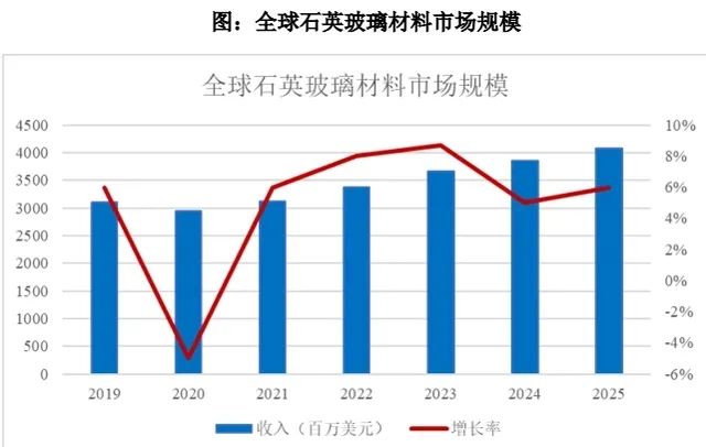 半導體行業是石英玻璃材料的主要應用領域,其他方向主要包括光伏、光纖通信和電光源等。從增速來看,半導體、光伏增速較高,是目前石英玻璃市場主要的增長引擎,預計未來市場占比進一步擴大。
