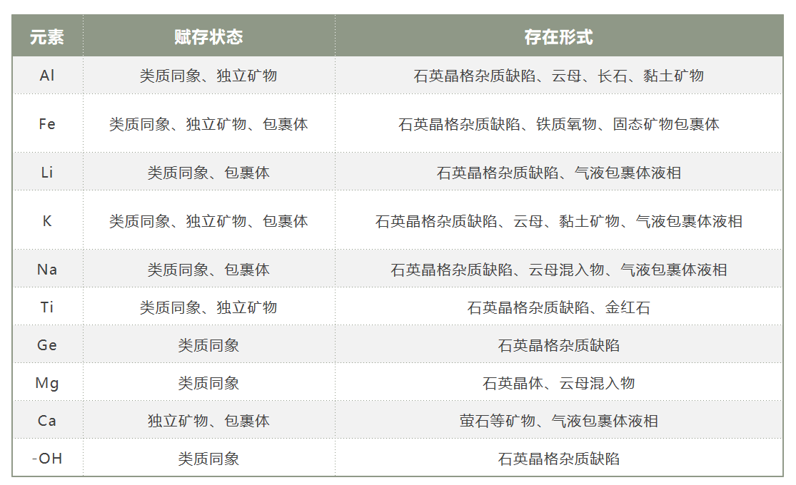石英晶體在形成過程中,一些元素會替代硅元素進入石英晶體中,形成了石英的結構性雜質。這些雜質含量雖然很低,但從石英中分離難度大,是制約高純石英質量最關鍵性因素。