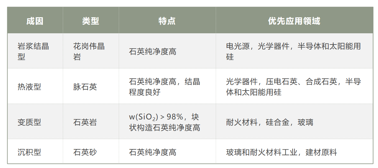 高純石英原料資源類型并不局限于由石英單一組成的天然礦物巖石,它的來源既包括地質產出條件嚴苛的水晶,又包括脈石英、石英巖、石英砂巖等,甚至可以從花崗偉晶巖等富石英礦物的巖石中獲取。不同成因類型的石英原料性質存在差異,應用領域也有所不同,但高純石英原料僅占其中一小部分,主要用于生產高附加值的產品。