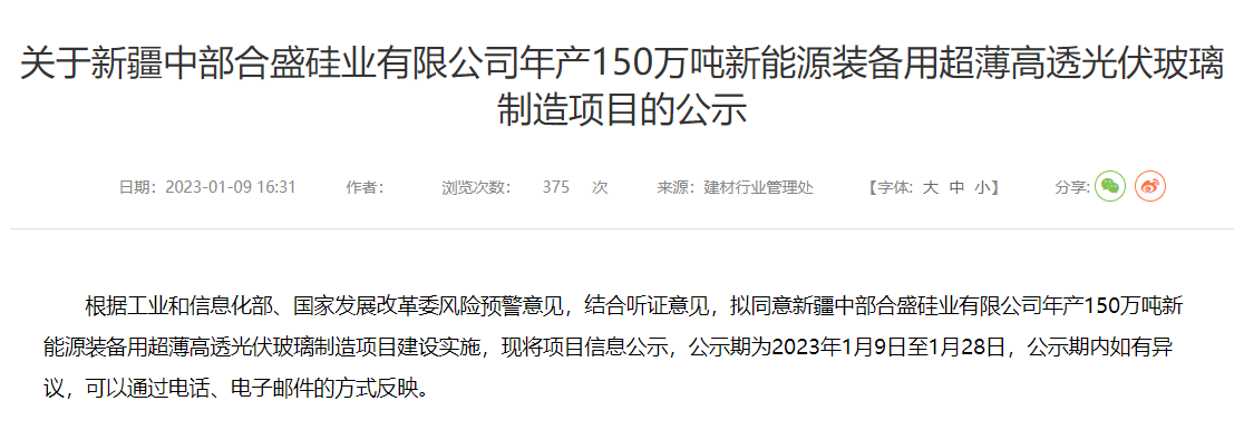 中國粉體網(wǎng)訊 2月7日,新疆工信廳官網(wǎng)發(fā)布了“關(guān)于新疆中部合盛硅業(yè)有限公司年產(chǎn)150萬噸新能源裝備用超薄高透光伏玻璃制造項(xiàng)目信息的公告”。