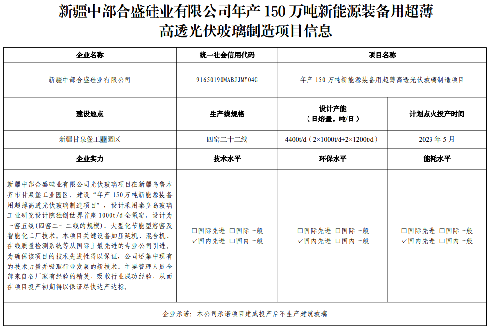 公告稱,根據(jù)工業(yè)和信息化部和國家發(fā)展改革委風(fēng)險(xiǎn)預(yù)警意見,結(jié)合聽證意見,擬同意新疆中部合盛硅業(yè)有限公司年產(chǎn) 150 萬噸新能源裝備用超薄高透光伏玻璃制造項(xiàng)目建設(shè)實(shí)施。