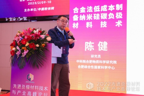 中科院合肥物質(zhì)科學(xué)院陳健研究員作《合金法低成本制備納米硅碳負(fù)極材料技術(shù)》報(bào)告