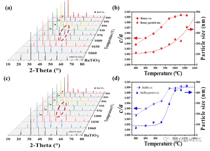 在此背景下,深圳電子材料院張蕾副研究員團隊成功采用兩步煅燒結合回轉爐煅燒的方法合成了顆粒均勻、高四方性的BaTiO3超細粉體。反應動力學研究發現,回轉爐提高了固相反應的傳熱效率,增加了Ba2+和Ti4+的點接觸面積,降低了兩者的擴散速率,使擴散成核生長速率大于BaCO3的分解速率,從而提高了Ba2+和Ti4+的反應活性,進而提高BaTiO3粉體的四方性。通過優化工藝、理解反應機理,采用兩步輔助回轉爐煅燒法成功地制備了平均粒徑為250nm、四方度(c/a)為1.0096的BaTiO3超細粉體。該工作克服了固相高溫煅燒引起的粗結晶和團聚問題,提高了粉體的四方性,為固相法生產高四方性BaTiO3超細粉體提供了新思路。