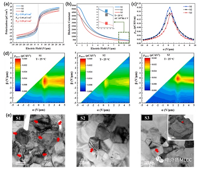 圖注:(a)直流偏壓場的介電常數依賴性(插入:8-10V/μm),(b)P-E環路,(c)可逆和(d)不可逆FORC分布的演化,(e)超薄MLCCs芯片的TEM圖像。