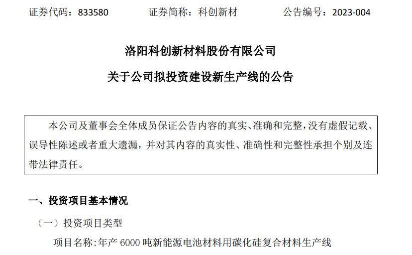 公告顯示,科創新材利用現有廠房,建設年產4000噸新能源電池材料用碳化硅復合材料坩堝生產線1條和年產2000噸新能源電池材料用碳化硅復合材料匣缽生產線一條。總投資共計1.3億元。新增及擴建后,項目占地面積約2萬平方米。