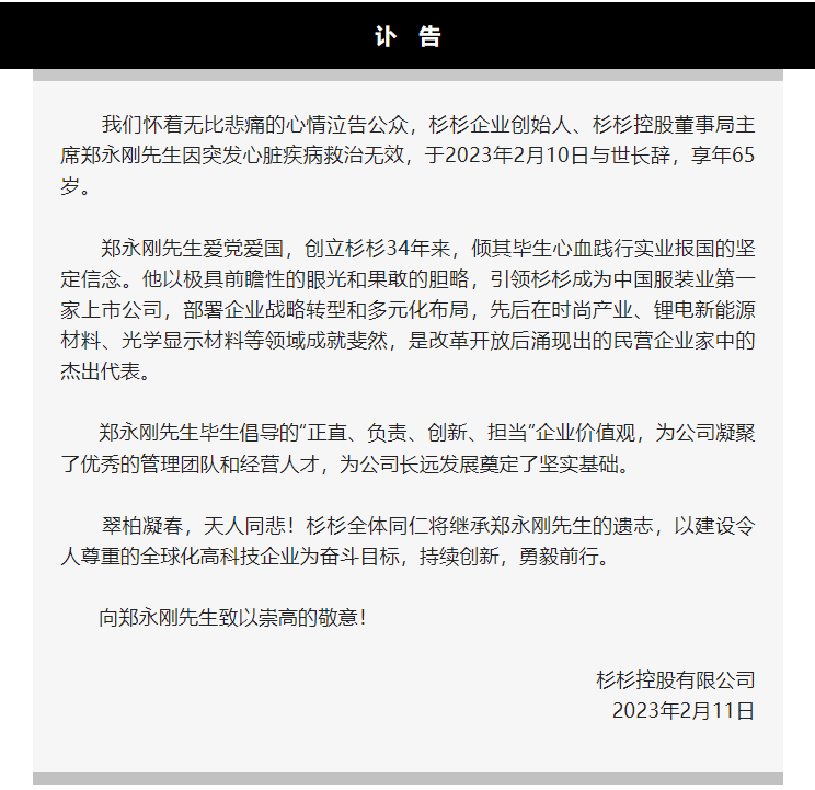 杉杉控股有限公司2月11日晚間在官微杉杉負極發布信息,杉杉控股有限公司董事局主席、杉杉品牌創始人鄭永剛于2023年2月10日病逝。據杉杉負極消息,鄭永剛因突發心臟疾病救治無效,享年65歲。