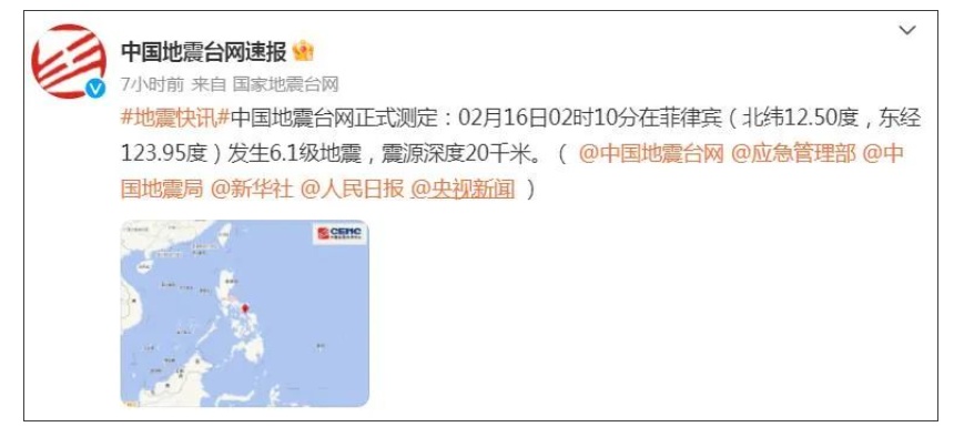 中國(guó)粉體網(wǎng)訊 據(jù)央視新聞:菲律賓火山地震研究所消息,當(dāng)?shù)貢r(shí)間2月16日2時(shí)10分左右,菲律賓中部馬斯巴特省附近發(fā)生6.0級(jí)地震,震源深度10公里,附近多地有震感。此次地震預(yù)計(jì)會(huì)造成損失,并伴有余震。