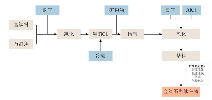 在現有技術條件下,鈦白粉的商業生產方法,無論是硫酸法還是氯化法,生產工藝冗長,技術紛繁復雜,涵蓋了幾乎所有的無機化工生產單元操作,涉及眾多科學與技術領域,非簡單的單一無機金屬氧化物的生產范疇所能企及。其中,氯化法鈦白由于其工藝流程短、環境污染小、能耗低、生產能力易于擴大和勞動生產率高等優點,得以迅速發展。