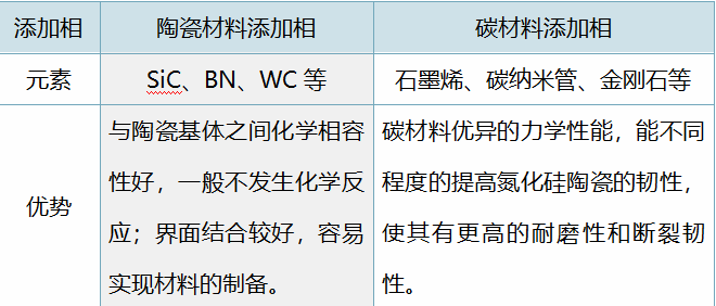 為了提高氮化硅陶瓷斷裂韌性、增加其在應用中的穩定性,除了添加必備的燒結助劑來使氮化硅陶瓷致密性增加外,引入適合的添加相也是提高氮化硅陶瓷力學性能的重要方法。一般根據成分的不同,可將添加相分為:陶瓷材料添加相、碳材料添加相、金屬添加相。