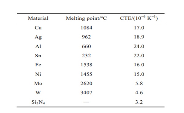 不同金屬與氮化硅陶瓷的熔點和熱膨脹系數對比