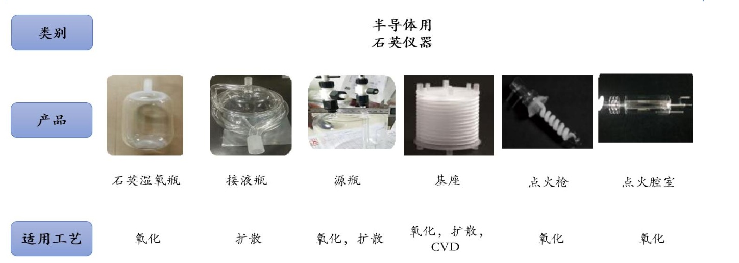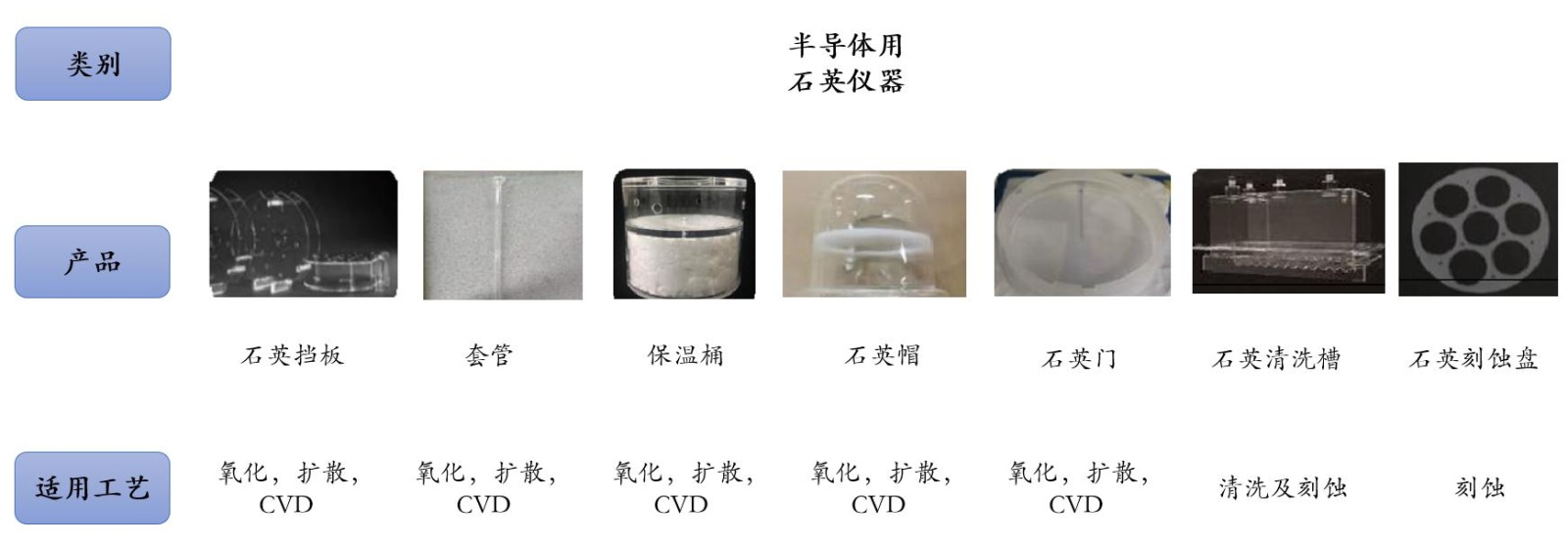 公司半導(dǎo)體用石英制品,主要有石英舟、石英管道、石英儀器三個類別,具有高純、耐高溫、化學(xué)穩(wěn)定性好的特點,主要應(yīng)用的環(huán)節(jié)有氧化、擴散、化學(xué)氣相沉積(CVD)、清洗、刻蝕。