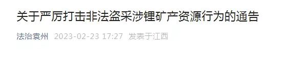 其中明確提出,將依法嚴厲打擊在全市范圍內非法偷采盜采、私挖濫采、無證開采、以探代采、超深越界開采鋰礦等礦產資源行為和非法買賣、存儲、加工、運輸無合法來源礦產品行為。