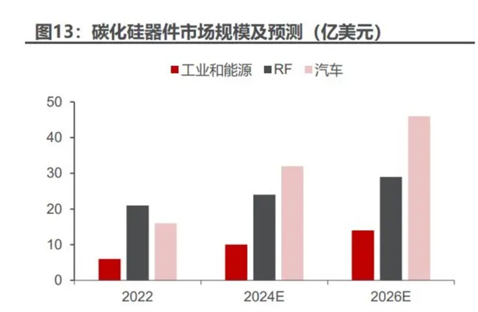 根據Wolfspeed的預測,2026年碳化硅器件市場規模有望達到89億美元,碳化硅有望在新能源汽車、工業和能源、射頻市場逐步完成對硅基器件的替代。