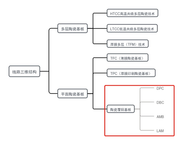 陶瓷基板按照工藝可分為DBC、AMB、DPC、HTCC、LTCC等基板,按照基板材料劃分主要為氧化鋁(Al2O3)、氮化鋁(AlN)和氮化硅(Si3N4)。