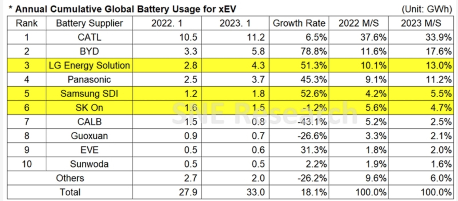 SNE Research指出,由于2023年新能源汽車補貼政策的中斷,中國1月份電動汽車(BEV+PHEV)的銷售量與去年同期相比減少了6.2%,但以寧德時代和比亞迪為首,中國電池企業仍然引領著市場。
